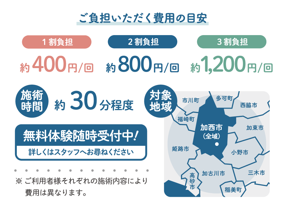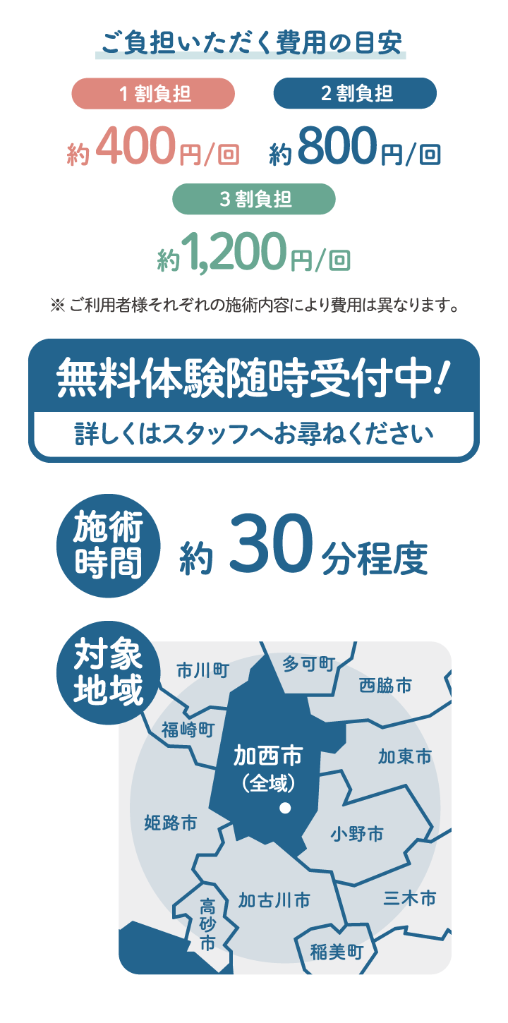 2回目以降の施術につきましては、お申込みが必要になります。無料体験や各種資料をよくご検討いただき、引き続きの施術をご希望される際は、お申込みに必要な書類一式をお渡しし、今後の流れをご説明させていただきます。