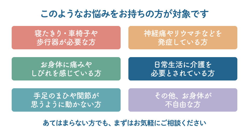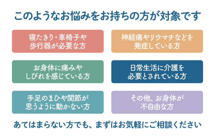 ご相談・お問い合わせは、お電話または当ホームページのメールフォームより受け付けております。はじめてご利用の方には、ご挨拶や施術内容をご理解いただき、安心して訪問リハビリサービスをご利用頂くため、無料体験治療を提供しております。ご訪問の日取りをお決めするとともに、ご住所やお名前など必要事項をお尋ねしますので、ご協力をお願い致します。
